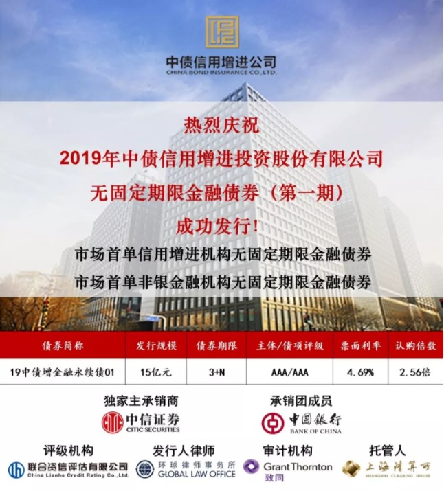 2019年7月12日,中债信用增进投资股份有限公司(“中债公司”)在全国银行间债券市场成功公开发行2019年无固定期限金融债券(第一期),发行规模为15亿元人民币,票面利率为4.69%,最终认购倍数达2.56倍,投资者涵盖银行、保险、券商、基金、非金融机构投资者等多种类型。这是全国首单信用增进机构发行的金融债券,同时也是全国首单非银金融机构发行的无固定期限金融债券。