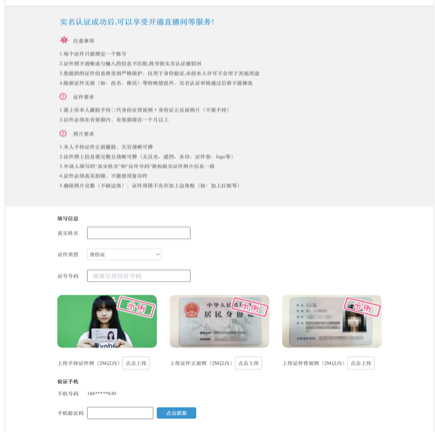 某互联网视频平台规定未成年人不能开通直播间服务,其实名认证的方式是露脸手持身份证正反面照片完成实名认证(如图6)。