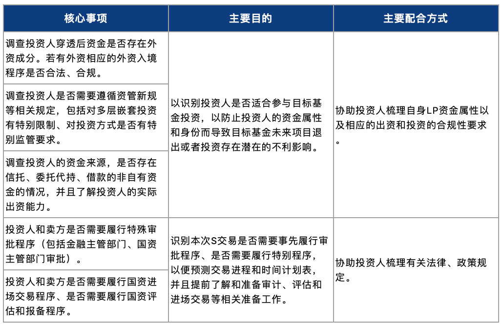 S交易中不仅需关注于对被投资方的正向尽职调查,同时还应做好充分准备以配合完成目标基金对投资人的反向尽职调查工作。其概括起来可以包括: