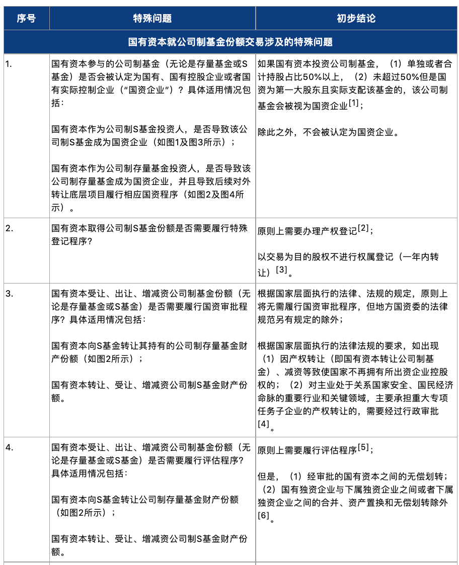 在上述归纳的主要交易模式中,国资既有可能向S基金转让财产份额(“直接参与”),也有可能作为存量基金或者S基金投资人间接参与财产份额和底层项目的转让(“间接参与”),此时因国资在存量基金和S基金的占比不同、交易方向不同,以及国资投资的基金的组织架构不同(常见的包括公司制和合伙制),而导致最终整体的监管要求不同,对此本文就区分各个不同类型,结合涉及公司制基金和合伙制基金的不同框架,对涉及国有企业认定、权属登记、国资审批、国资评估、进场交易等问题一并进行梳理和归纳(值得注意的是,本文涉及的国资问题暂不讨论特殊监管要求的涉金融、文化、军事等国资机构及其相关事宜):