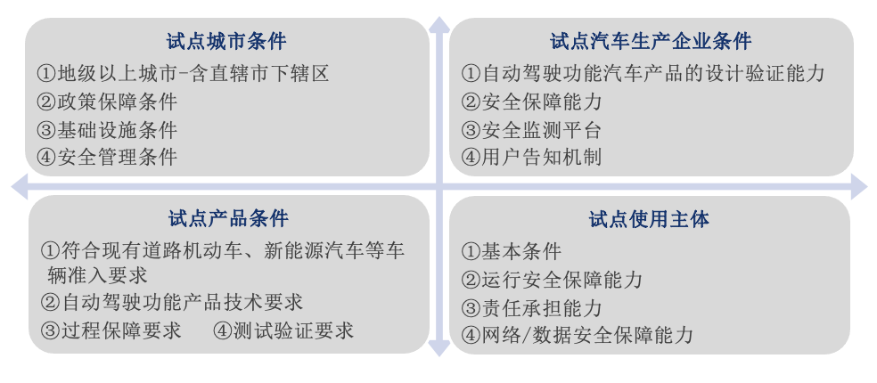 《试点通知草案》对试点城市、试点汽车生产企业、试点车辆产品以及试点使用主体分别设置了非常具体细致的要求(具体详见《试点通知草案》正文各章节内容及五大附件),部分要求属于一目了然的硬性条件,而部分要求则仍需在符合性上提供足够有说服力的证据配合支撑。