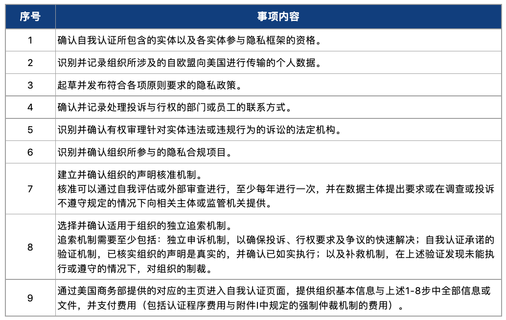 但值得注意的是,除了前述第14086号行政命令中提供的进一步保障举措外,《欧盟-美国数据隐私框架原则》与《欧盟-美国隐私盾原则》的实质内容几乎完全一致,均包含7项个人数据保护基本原则[6]、16项补充原则[7]以及附件I中对于救济与执行的规定。此外,两者关于认证的机制也相同。需要进行跨境数据传输的公司或组织需要每年通过美国商务部的自我认证(第6项)及核准程序(第7项),向美国商务部提交相关文件及信息,并提供针对自我认证的核准及追索,以确保落实框架确立的原则以及仲裁机制;而企业即便在主动退出后也需要每年填写并提交问卷,以便于美国商务部持续追踪其数据跨境实践。我们将相关的通用程序与要求整理并总结如下表:
