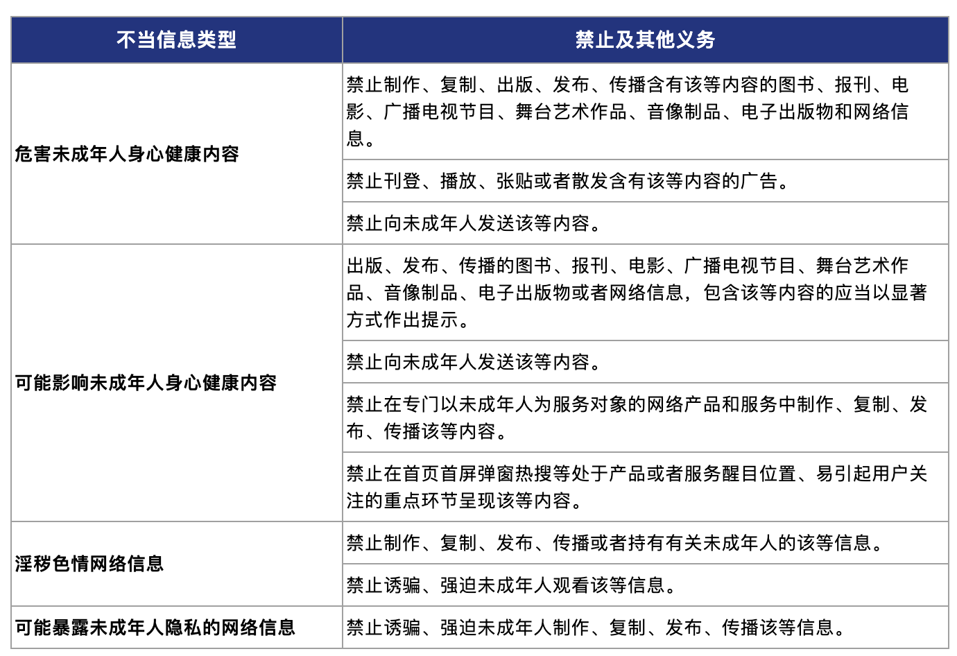 《未保条例(征求意见稿)》第三章在《未保法》的基础上,对不同类别的不良信息与禁止行为、在线教育类特殊义务,以及各类不当内容及行为的处置义务均作出了较为详细的规定。