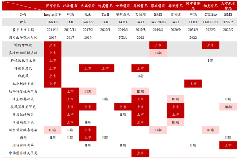 其中,截至2022年4月,国内在研JAK抑制剂适应症及临床进展也较为迅速,多家药企均进行了布局。