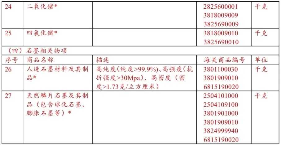 此部分清单原本收录了(一)挖泥船和(二)高压水炮共计两类11项具体的产品。在此基础上,2024年《目录》新增加了(三)镓、锗相关物项和(四)石墨相关物项共计两类16项具体的产品。