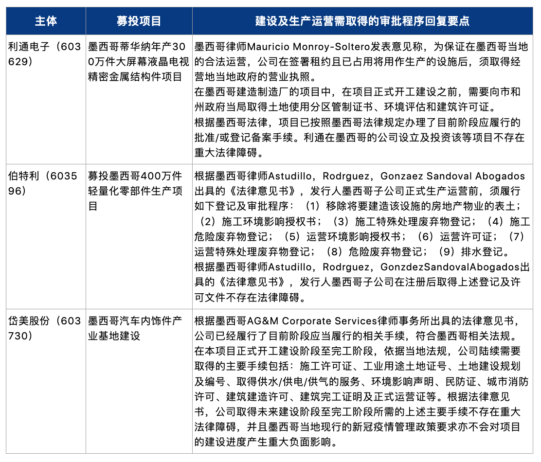 由于具体要求可能因项目类型、位置和规模而异,需要履行的审批程序也不尽相同。在利通电子、伯特利、岱美股份墨西哥募投项目问询回复中,关于审批程序可以归纳为两个要点,分别为项目建设过程中需要取得的审批及项目生产运营过程中需要取得的审批。利通电子、伯特利、岱美股份关于该等问题的回复要点如下: