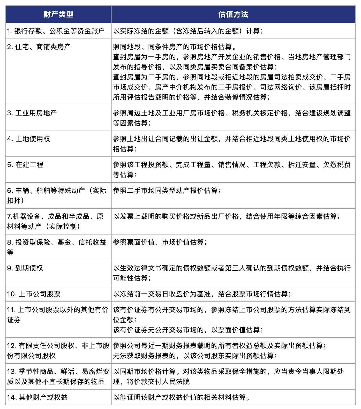 《江苏高院查封、扣押、冻结指引》第11条和第14条规定了13种常见财产价值的估算方法(参见下表),为实践中判断是否超标的查封、扣押、冻结提供参考依据。同时,要求法院应当根据当事人提供的证明申请保全财产价值的证据及该财产实际情况确定该财产价值。如果依照下列估值方法仍然难以估算财产价值的,可以通过询价或评估方式确定财产价值。