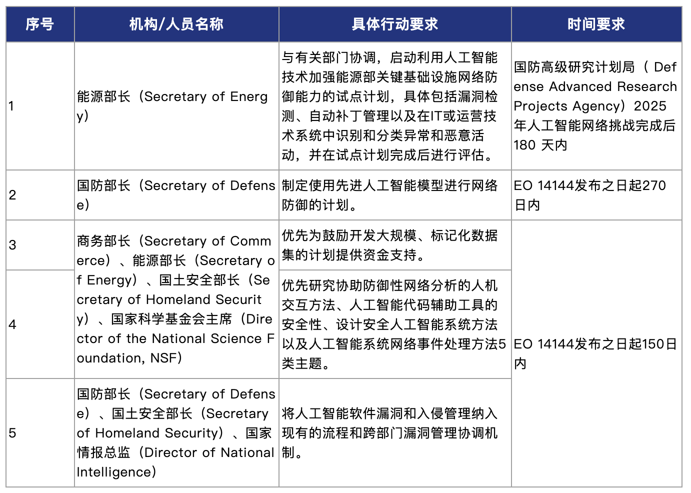 EO 14144强调了人工智能在网络安全中的重要性,要求联邦政府加速人工智能开发和部署,探索利用人工智能技术改善关键基础设施网络安全的方法,加速人工智能与网络安全交叉领域的研究。我们将各联邦机构应采取的行动梳理如下: