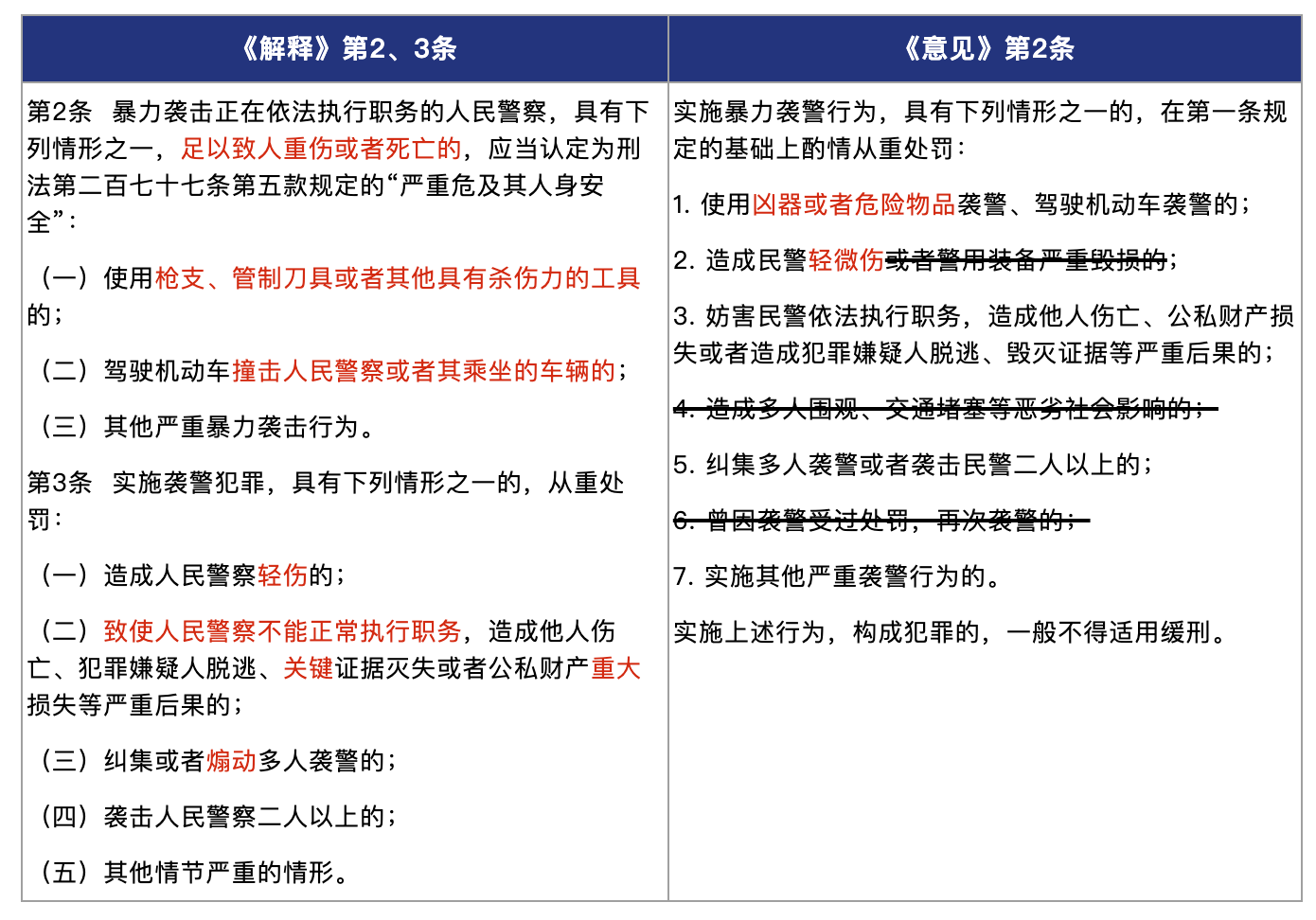 第二,阐述了袭警行为所涉不同犯罪的适用。如下表所示,《意见》也论及了袭警行为所涉的不同犯罪,二者规定有所不同。