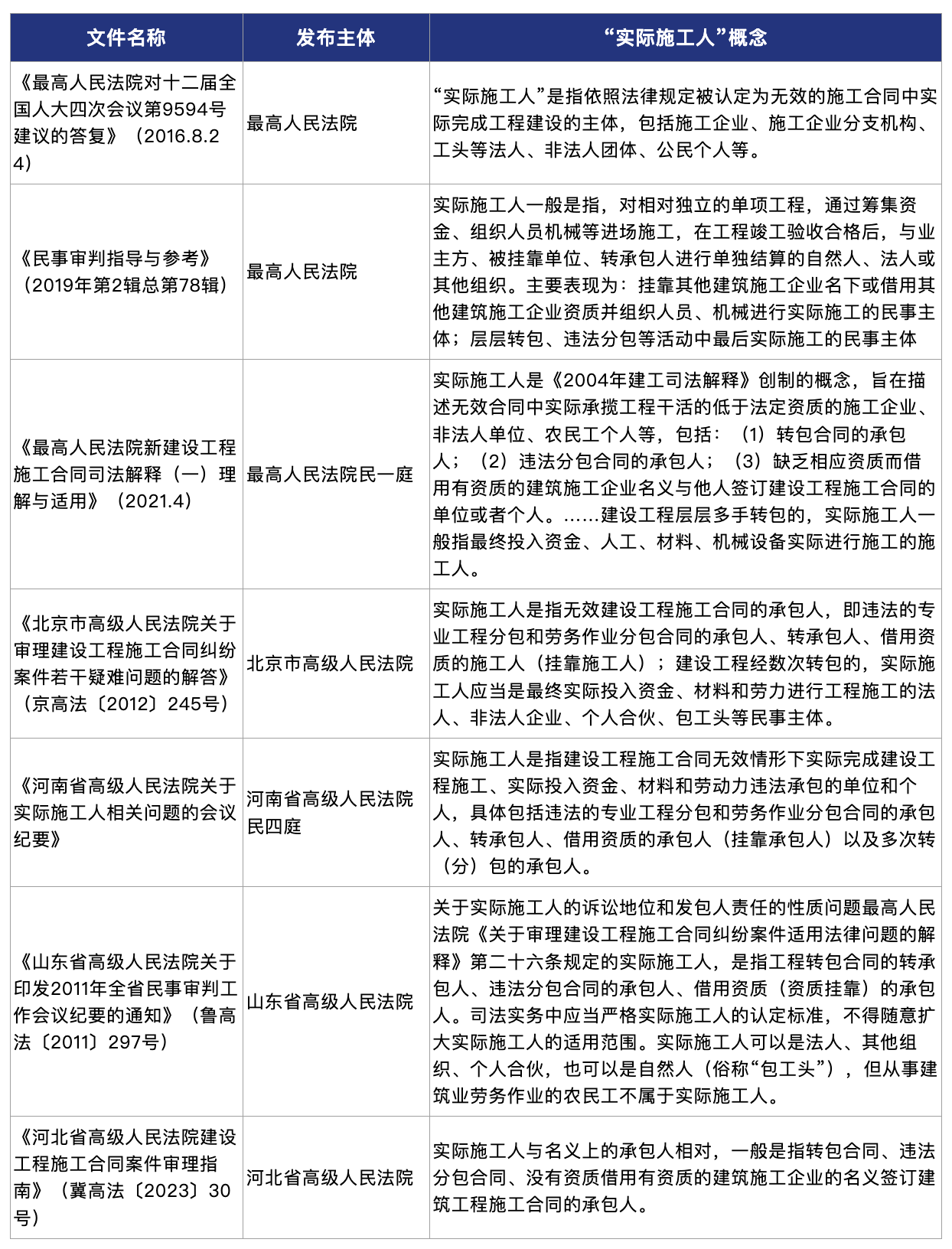 司法实践中,最高院及部分高院曾发布相关文件对实际施工人的概念进行明确,具体如下: